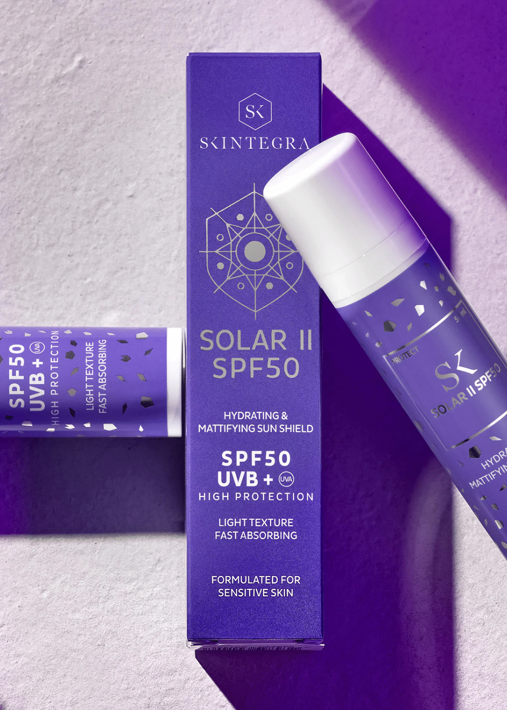 Skintegra Solar II zaštitni fluid SPF50+ je napredna zaštita od sunca koja kombinira šest fotostabilnih organskih UV filtera, uključujući filter nove generacije topiv u vodi. Ova kombinacija pruža širokospektralnu zaštitu od UVA, UVB, IR i vidljive svjetlosti.Tekstura fluida je lagana, nemasna i brzo se upija, što ga čini prikladnim izborom za svakodnevnu zaštitu svih tipova kože.Osim UV zaštite, Solar II je obogaćen ektoinom, ekstraktom zelenog čaja, betainom i vitaminom E, koji pružaju antioksidativnu zaštitu, umiruju kožu i pomažu održati optimalnu hidrataciju.Posebno je pogodan za one koji traže nevidljivu zaštitu bez bijelih tragova i uravnoteženje kože bez suvišnog sjaja.